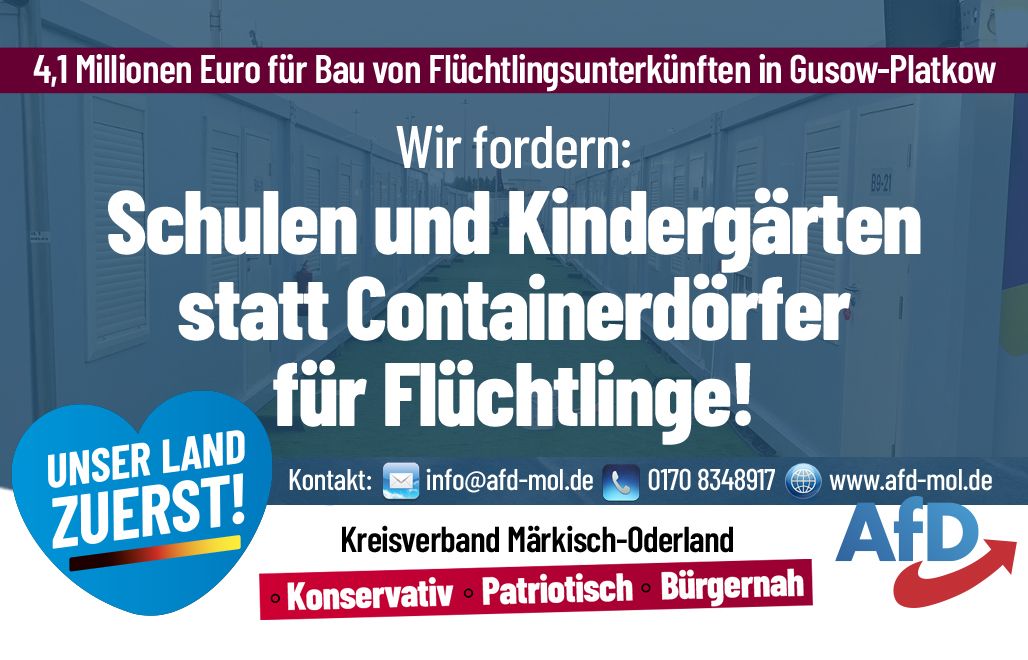 Wie wir einem Artikel in der Märkischen Oderzeitung vom 09.06.2023 entnehmen mussten, plant der Landkreis Märkisch-Oderland in der Gemeinde Gusow-Platkow die Errichtung von weiteren Flüchtlingsunterkünften. Die Baukosten inklusive Planung sollen sagenhafte 4,1 Millionen Euro betragen und werden teilweise durch Landesmittel finanziert. Wenn man bedenkt, wie lange und vor allem erfolglos viele Städte und Gemeinden in unserem Landkreis um die Gelder für die Errichtung oder Sanierung von Schulen und Kindergärten kämpfen, macht einen der leichtsinnige Umgang mit unseren Steuergeldern nur noch fassungslos. Die AfD in Märkisch-Oderland fordert daher "Schulen und Kindergärten statt Containerdörfer für Flüchtlinge". Bitte teilen Sie unseren Beitrag wenn Sie ihn unterstützen.