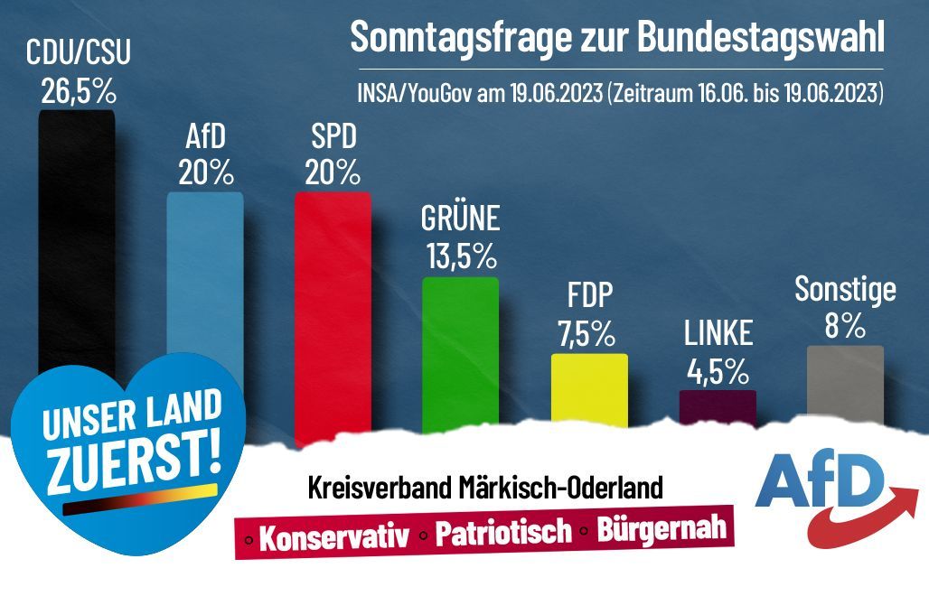Bei der aktuellen Umfrage des Meinungsforschungsinstituts INSA/YouGov zur Bundestagswahl legt die AfD erneut einen Prozentpunkt zu (Stand 19.06.2023).