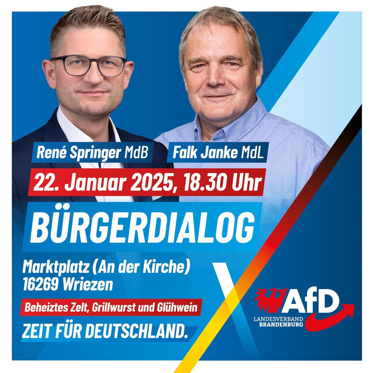 Im Rahmen unseres Bundestagswahlkampfes in Märkisch-Oderland findet am 22.01.2025 in Wriezen ein Bürgerdialog statt. Gastgeber und Redner sind unser Direktkandidat zur Bundestagswahl im Wahlkreis 59, René Springer und der Landtagsabgeordnete Falk Janke.