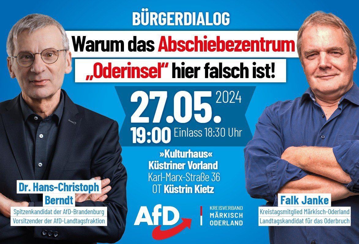 Wir informieren Sie zu diesem Thema beim Bürgerdialog am 27.05.24 in Küstrin-Kietz und zeigen die Lösung auf, wie wir dieses Ziel erreichen werden. Zu Gast ist der Spitzenkandidat der AfD für die Landtagswahl Brandenburg im Herbst, Dr. Hans-Christoph Berndt.