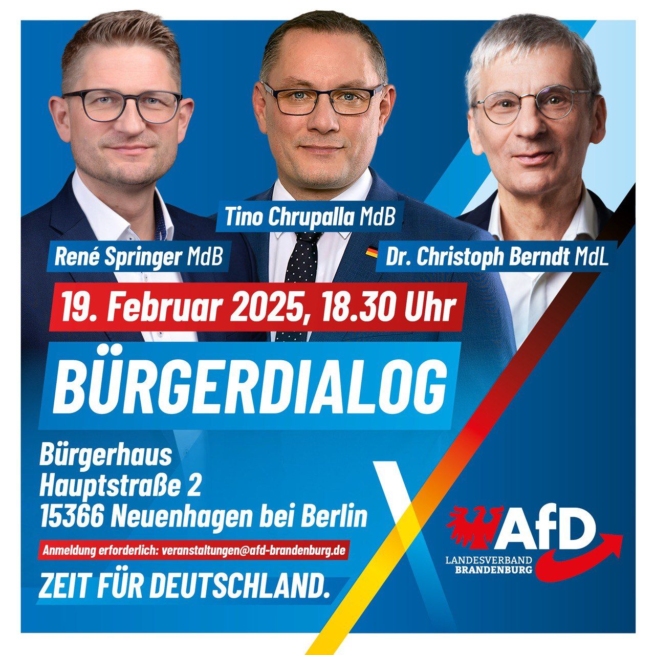 Am 19. Februar 2025 um 18:30 Uhr laden wir Euch herzlich zum Bürgerdialog mit Tino Chrupalla, Dr. Hans-Christoph Berndt und René Springer ein!