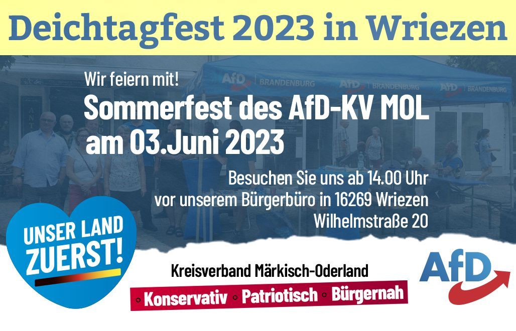 Am 03.Juni 2023 feiert der AfD-Kreisverband Märkisch-Oderland ab ca. 14.00 Uhr sein jährliches Sommerfest.