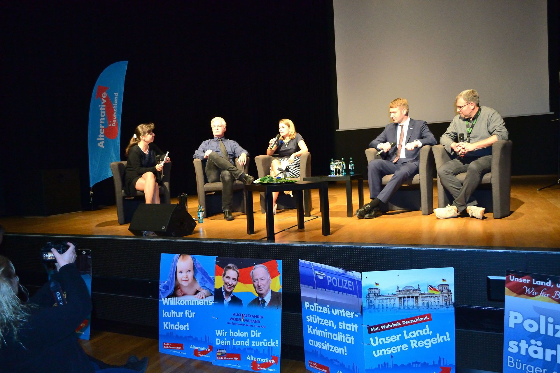 Abschließend wurden noch einige Fragen aus dem Publikum auf einer Podiumsdiskussion der verbliebenen Redner ( Kalbitz fuhr nach Chemnitz) diskutiert und beantwortet. Eine Frage beinhaltete noch einmal besonders das Tagesthema: Ob man sich mehr neoliberalen Ansätzen im Sozial-, Arbeits- und Rentenbereich hinwenden werde oder eher näher denen der einfachen Arbeitnehmerschaft, der (unteren) Schicht der viel umworbenen bürgerlichen Mitte? Hillberger gab folgende Antwort, Poggenburg bestätigte dies: Arbeiter und Angestellte sind auch unsere Zielgruppe der bürgerlichen Mitte. Leiharbeit muss geändert werden auf das französische Modell. 30-40% mehr Lohn denen, so wird dieser flexible Arbeitsplatzbedarf nicht zur Gewinnoptimierung verwendet. Dem einen Riegel vorschieben, so dass der Betrieb motiviert wird, nach einer festgelegten Zeit diesen in die Stammbelegschaft zu übernehmen.