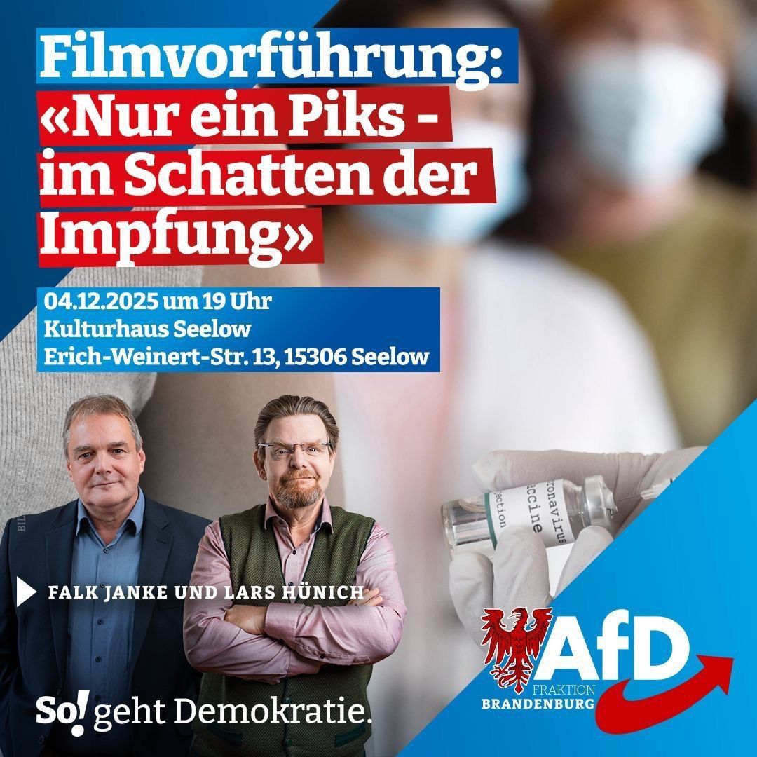 "Nur ein Piks - im Schatten der Impfung" - Dieser Film geht unter die Haut und deshalb freuen wir uns, Euch diesen Film exklusiv zeigen zu können. Im Rahmen eines Bürgerdialogs zur Aufarbeitung der Corona-Politik wird am 04.12.2025 im Kulturhaus Seelow der Erfolgsfilm "Nur ein Piks - Im Schatten der Impfung" vorgeführt.