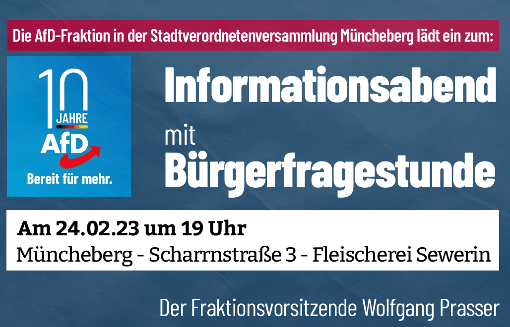 die Fraktion der AfD in der SVV Müncheberg veranstaltet einem Informationsabend mit anschließender Bürgerfragestunde.