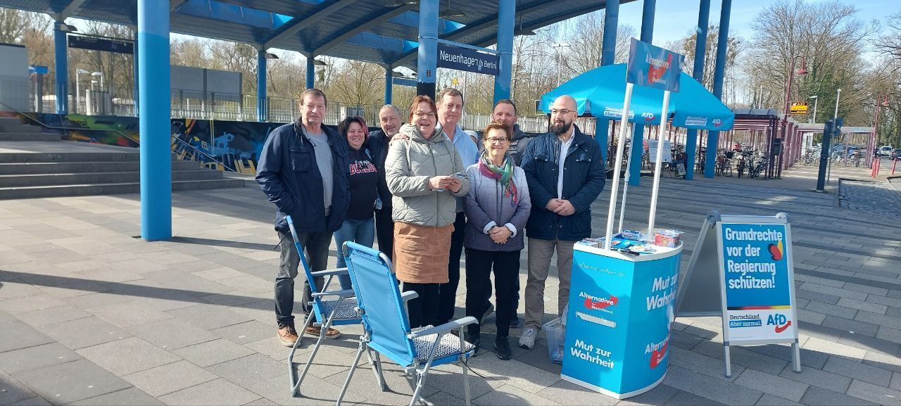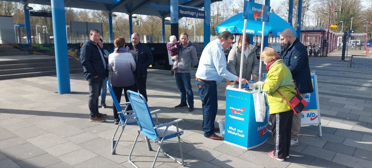 Landtagswahlkampf in Neuenhagen: Mittwoch Vormittag konnten die Neuenhagener den Direktkandidaten der AfD im Wahlkreis 31 kennenlernen. Unterstützung erhielt Rainer Galla bei seinem Infostand von unserem "Team Neuenhagen", bestehend aus ortsansässigen Mitgliedern und Kandidaten für die bevorstehende Gemeinderatswahl. Die Landtagswahl in Brandenburg findet am 22.09.2024 statt.