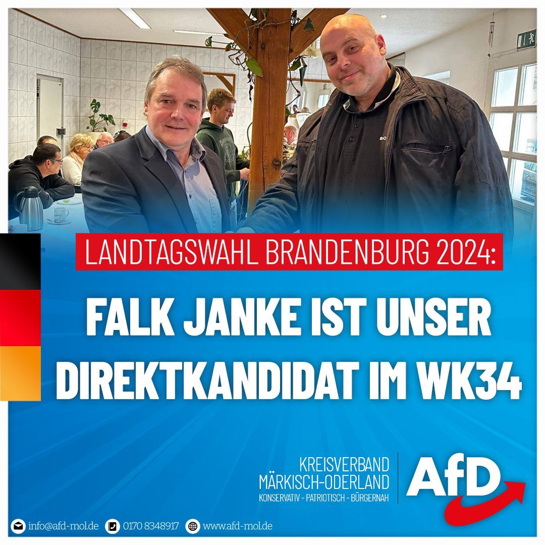 AfD: 100 % für Janke - Auf einer Mitgliederversammlung in Müncheberg haben die im Wahlkreis 34 wohnenden Mitglieder der AfD heute den Werbiger Falk Janke zum Direktkandidaten für die Landtagswahl am 22.09.2024 bestimmt. Janke wurde einstimmig gewählt – ohne Gegenstimmen oder Enthaltungen, er trat ohne Gegenkandidaten an.