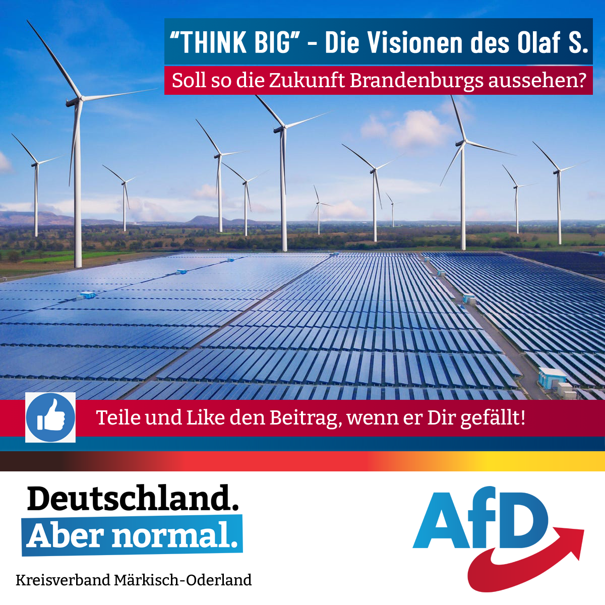 Groß - Größer - Think big! Wer baut die meisten und größten Windkraftanlagen und Solarparks in Deutschland? Bundeskanzler Scholz hat ganz klare Visionen für unser schönes Bundesland. Bisher lebt Brandenburg trotz der jüngsten Milliardeninvestition durch Tesla immer noch zu einem großen Teil vom Tourismus. Doch damit ist bald Schluss. Brandenburg soll zu einem Eldorado für Investoren und Betreiber im Bereich der sogenannten "erneuerbaren Energien" werden. Scholz nennt das "Reindustrialisierung". Wir nennen das Zerstörung von Flora und Fauna unter dem Deckmantel des Klimaschutzes! Für uns sind Windräder nicht das Symbol des Fortschritts, sondern Denkmäler einer fehlgeleiteten Energiepolitik und der Korruption.